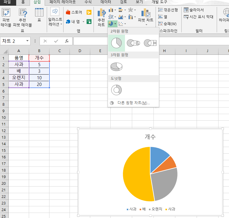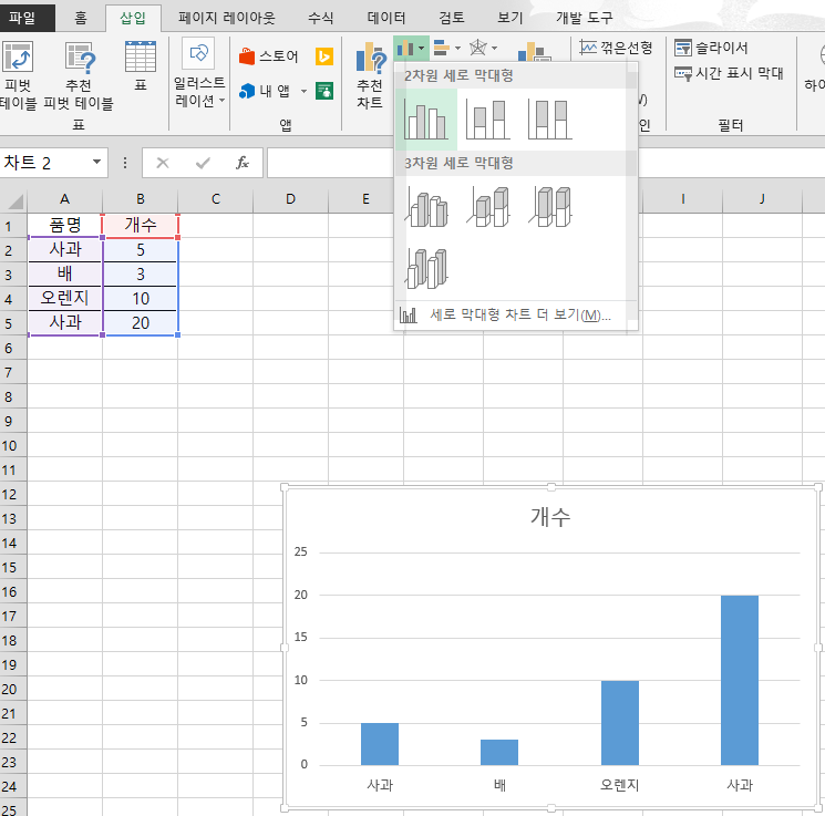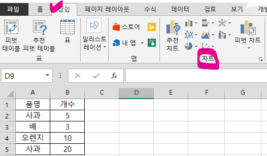 2. 상단 메뉴에서 삽입 탭을 클릭한 후, 차트를 선택합니다.