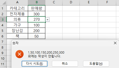 5. 사용자가 목록 외의 데이터를 입력할 경우 표시할 오류 메시지를 설정합니다.