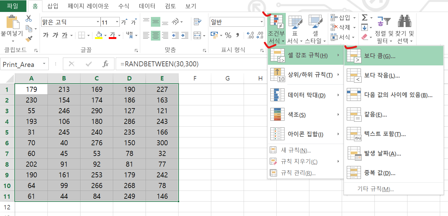 엑셀에서 조건부 서식을 설정하는 방법은 다음과 같습니다: