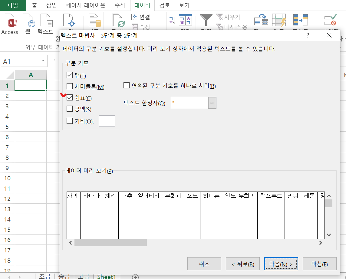 - 파일 가져오기 마법사가 열리면 데이터 형식(구분 기호나 고정 너비)을 설정합니다. 일반적으로 CSV 파일은 쉼표를 기준으로 구분되고, 텍스트 파일은 탭이나 공백으로 구분됩니다. 이 단계에서 데이터가 어떻게 구성될지 미리 확인할 수 있습니다.