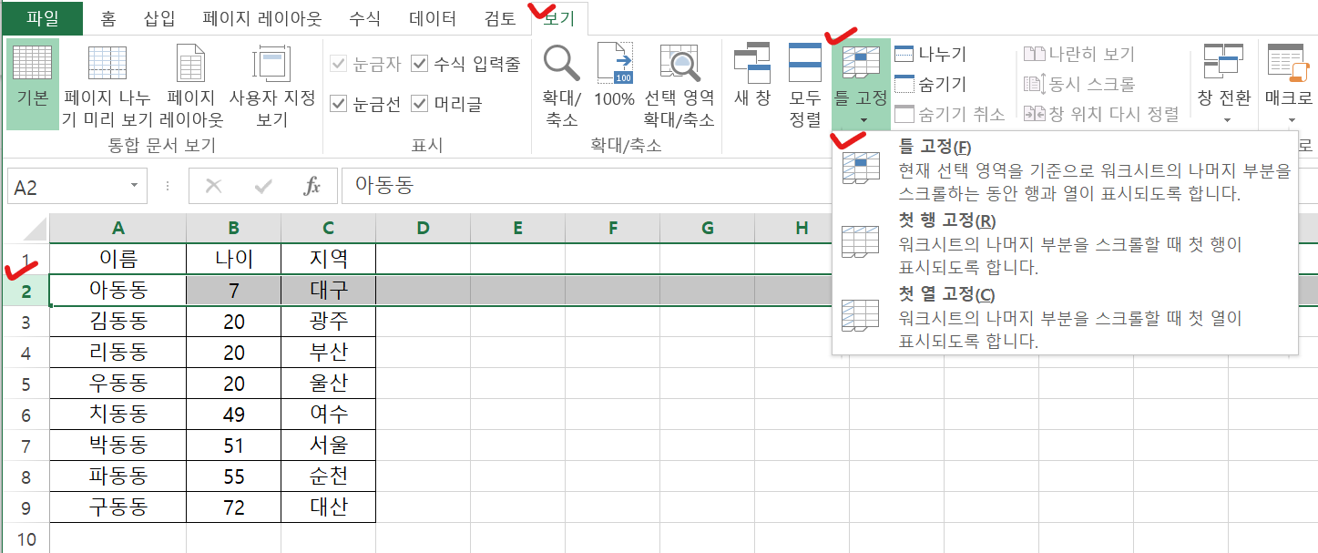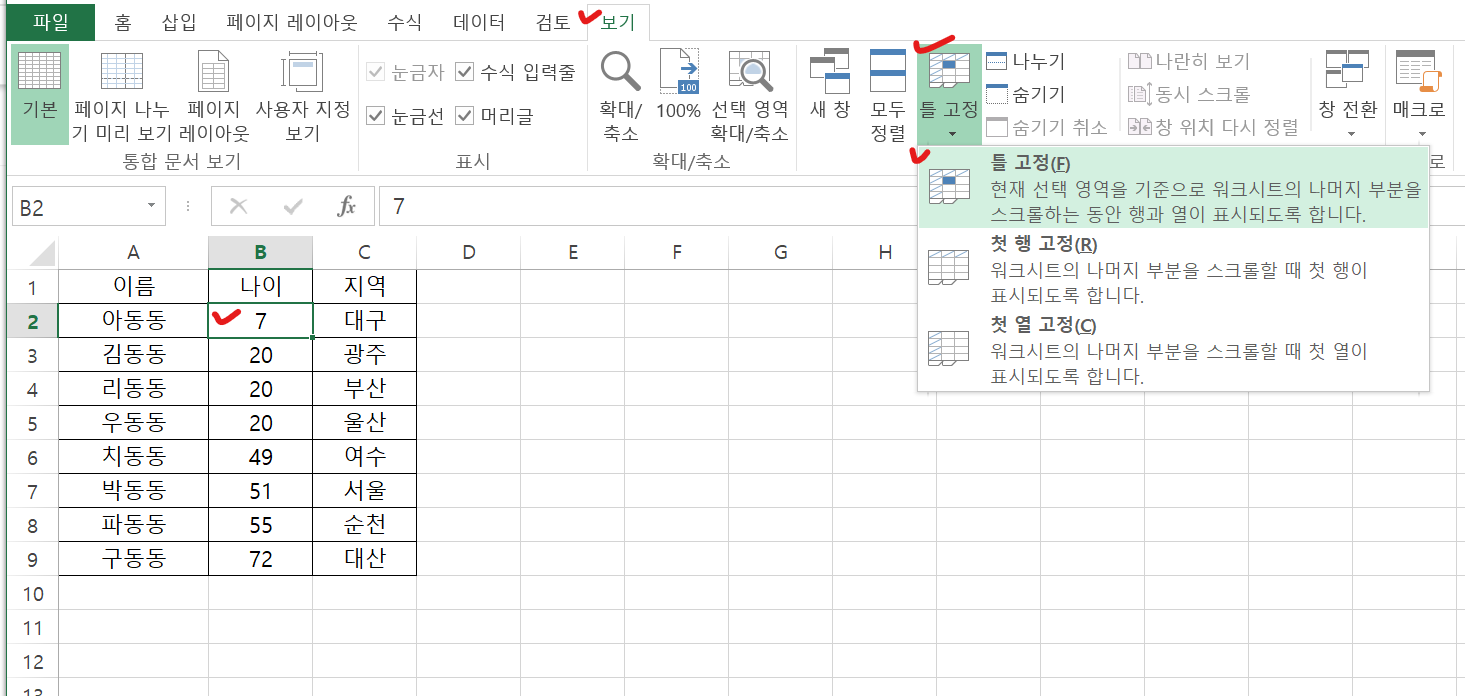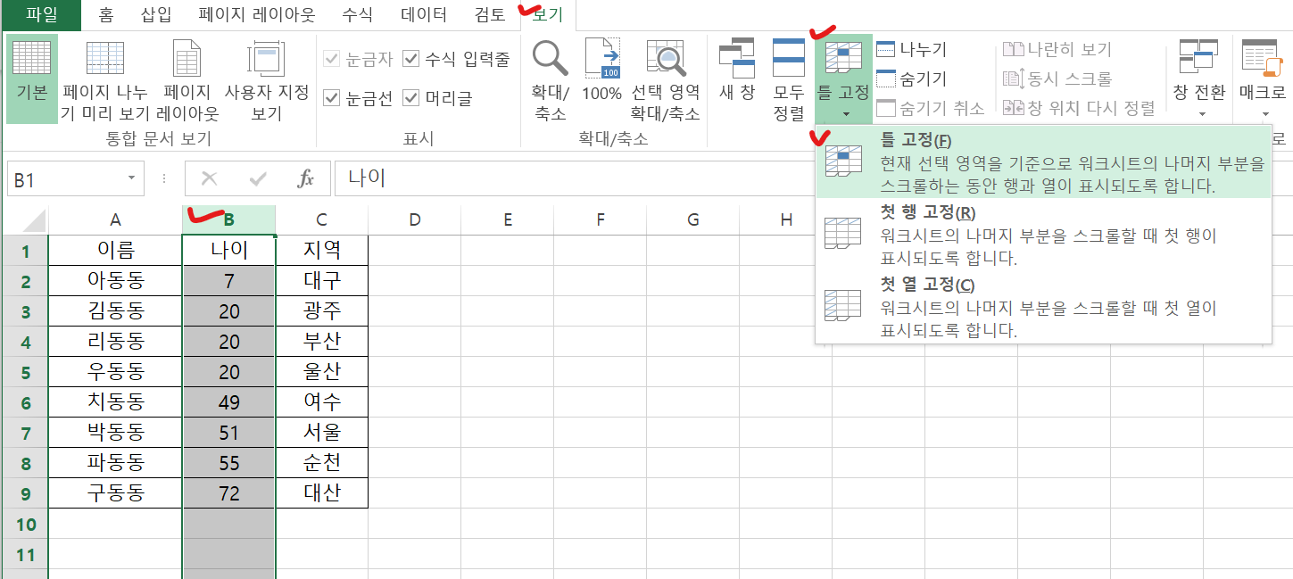 - 그 후 틀 고정을 클릭하고, 틀 고정 옵션을 선택합니다.