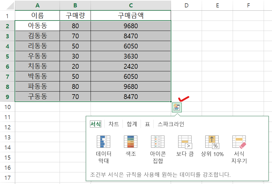 - 선택한 데이터 범위의 오른쪽 아래에 나타나는 빠른 분석 도구 아이콘을 클릭합니다.