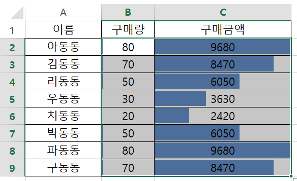- 조건부 서식으로 데이터에 대한 시각적 강조를 적용할 수 있습니다. 예를 들어, 데이터 막대 또는 색조를 선택하여 데이터를 비교할 수 있습니다.