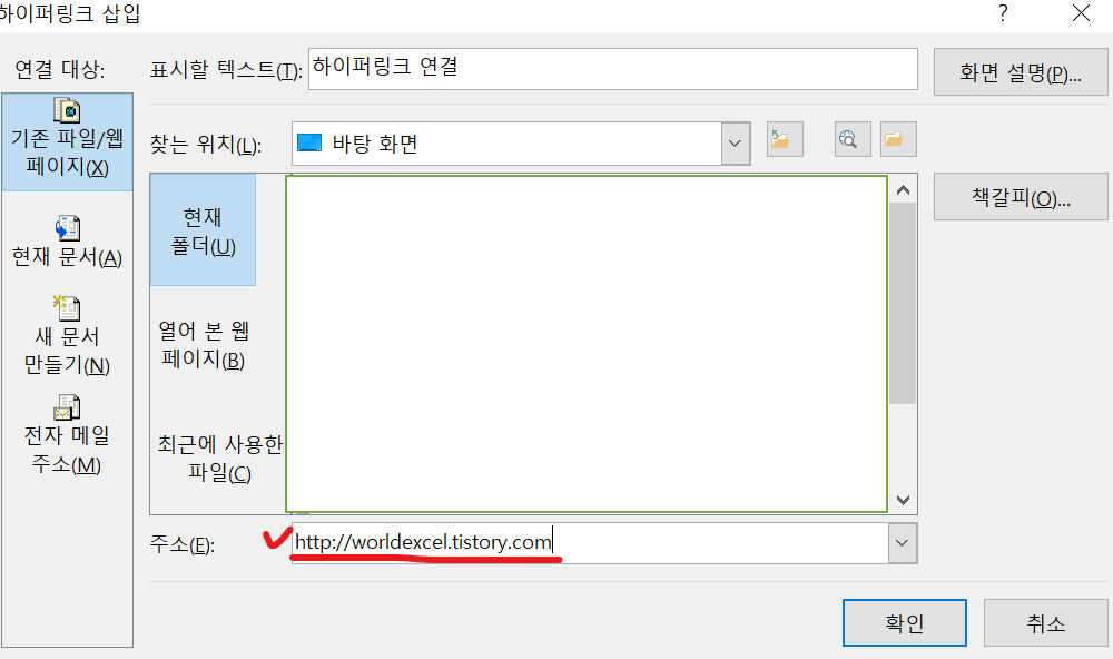 3. 링크 삽입 창이 열리면, 주소 부분에 연결할 웹사이트 URL을 입력합니다. 예를 들어, https://worldexcel.tistory.com을 입력할 수 있습니다.