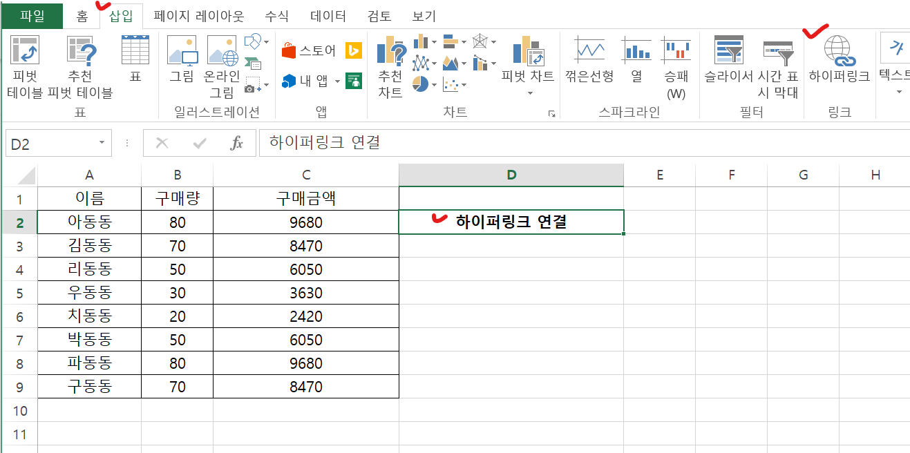 1. 하이퍼링크를 추가할 셀을 선택합니다.