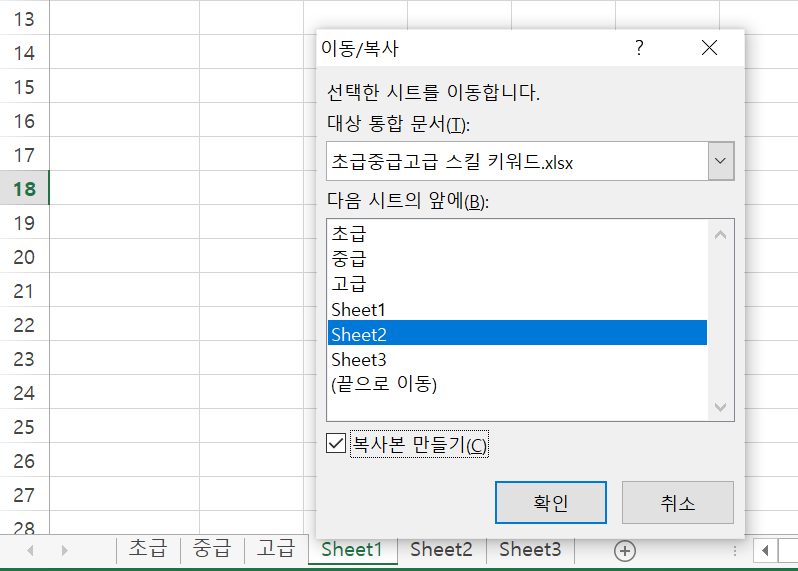 - 복사본 만들기를 선택한 후, 확인을 클릭하면 지정한 다른 파일로 워크시트가 복사됩니다.
