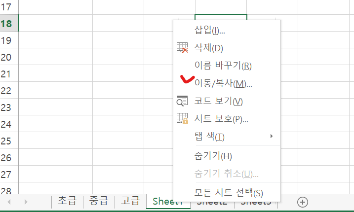 - 복사하려는 워크시트의 시트 탭을 마우스 오른쪽 버튼으로 클릭하고, 이동 또는 복사를 선택합니다.