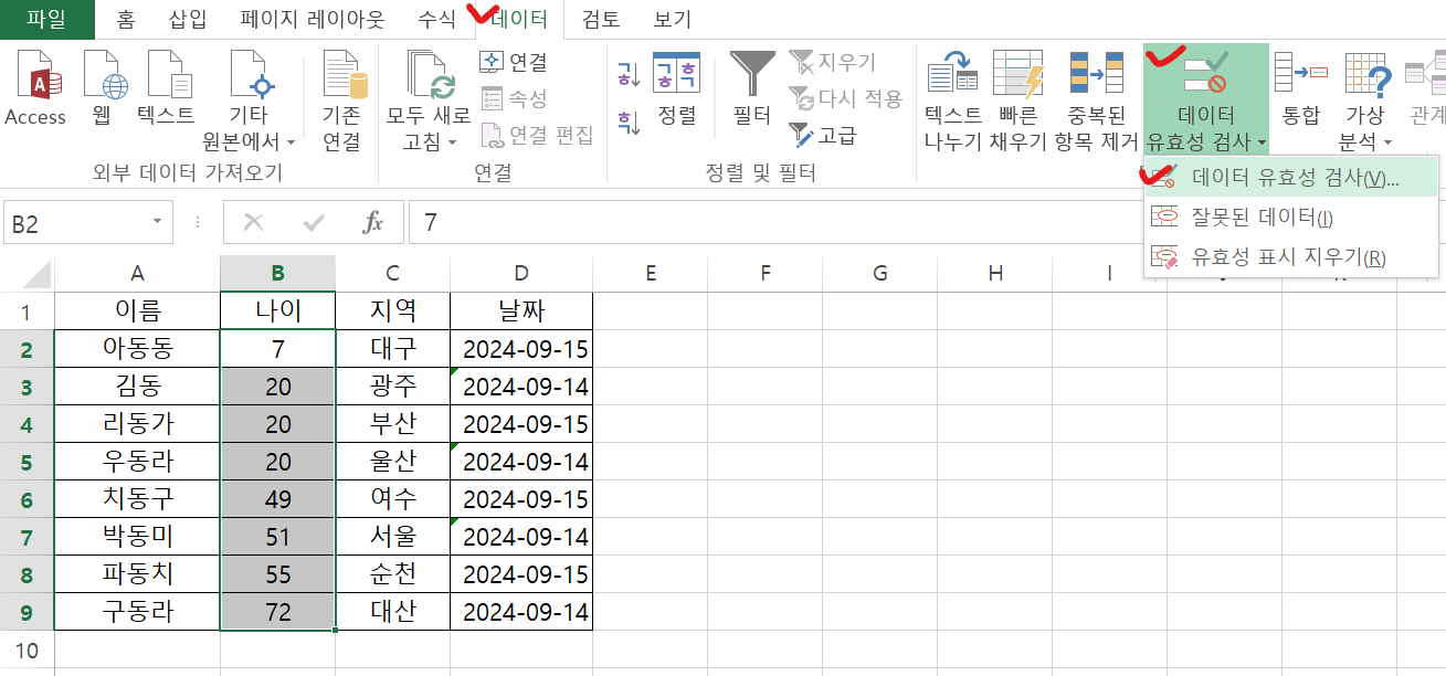 데이터 유효성 조건 추가 방법은 아래와 같습니다: