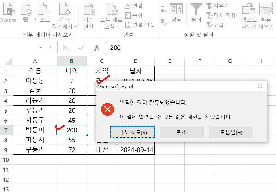 - 에러 메시지 설정: 잘못된 데이터를 입력했을 때 표시될 에러 메시지를 설정하여 사용자에게 경고를 제공합니다. 에러 메시지를 설정하면 사용자가 입력한 데이터가 조건에 맞지 않을 경우 명확한 경고를 받을 수 있으며, 데이터를 수정할 수 있는 기회를 제공합니다. 예를 들어, "입력한 값이 유효한 범위를 벗어났습니다"라는 메시지를 설정하여 사용자에게 오류의 원인을 알려줄 수 있습니다.