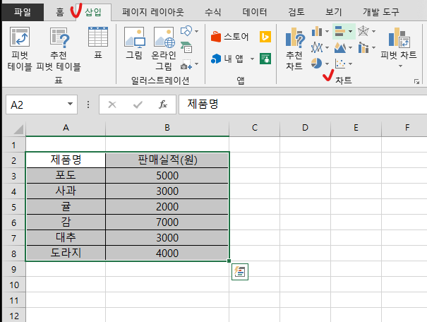 엑셀에서 그래프 및 차트를 삽입하고 수정하는 단계는 다음과 같습니다.