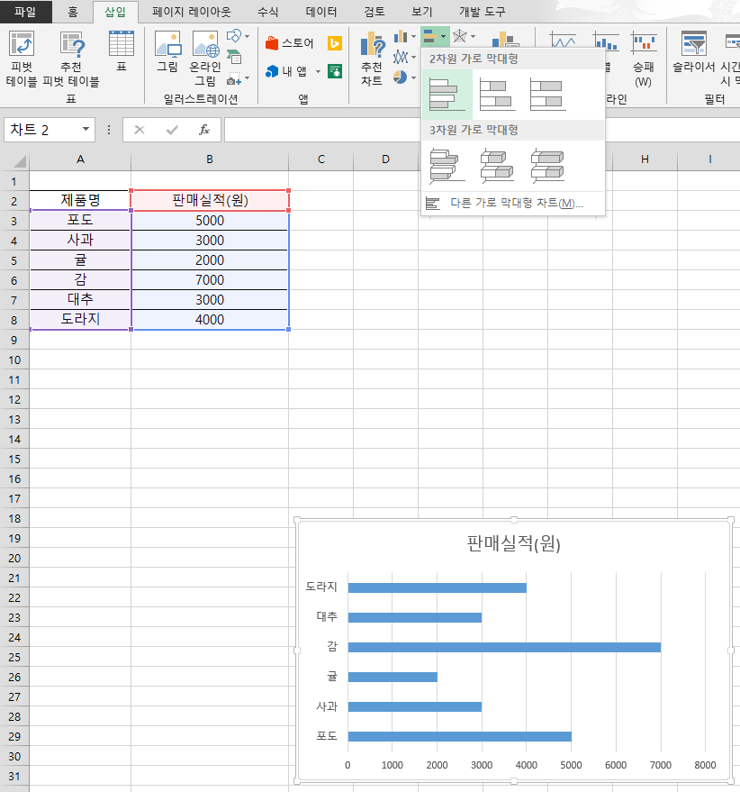 2) 차트로 만들 데이터 선택 - 차트로 만들 데이터 범위를 선택합니다. 예를 들어, 제품명과 판매 실적 열을 선택합니다.